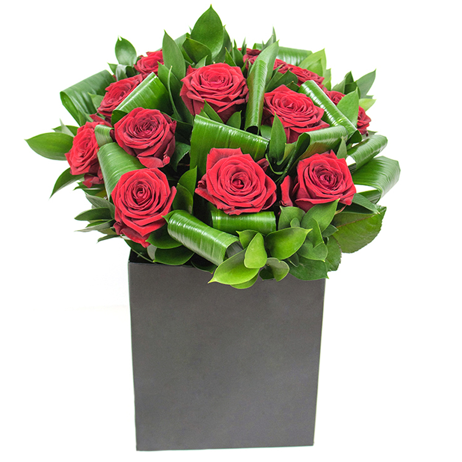 Dive into a world of refined elegance with our unique bouquet featuring red roses that are both bold and beautiful. Paired with crisp aspidistra leaves and subtle ruscus, this arrangement expresses a timeless charm that brightens any room.